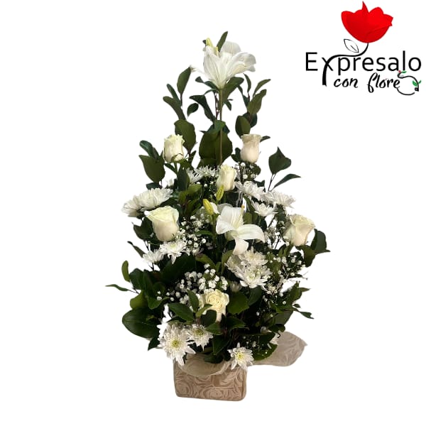 Bello arrimo en base con elegantes flores blanacas, rosas, lilum maules y follaje con lazo en cinta de organza.