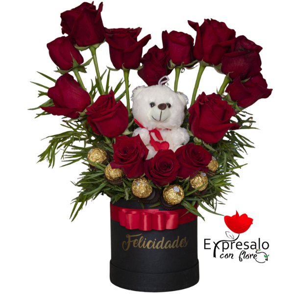 Lindo box con 14 rosas rojas en forma de corazón mas verde y bombones con tierno peluche y lazo con cinta de tela