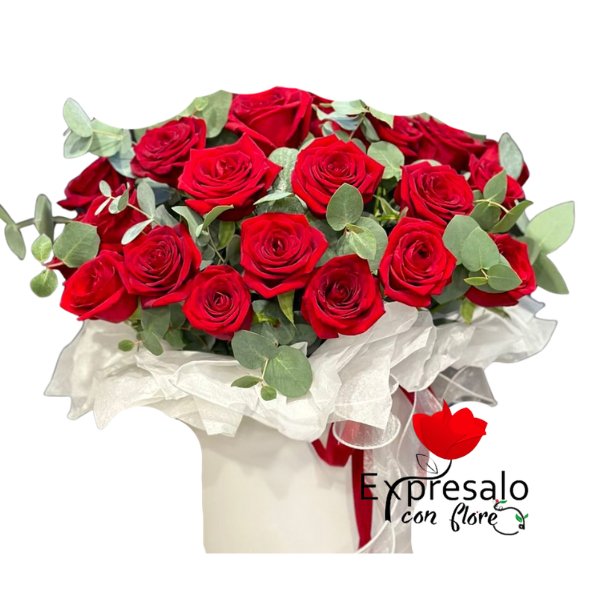 Lindo box con 20 rosas rojas y eucalipto mas lindo lazo con cinta de tela.