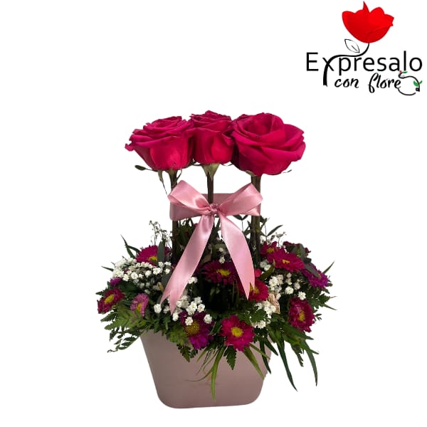 box con 6 rosas y maule de colores
