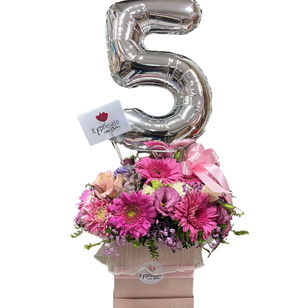 Lindo box con gerberas, rosas, lisianthus y verde de temporada con globo metálico (elegir modelo de globo al momento de comprar)