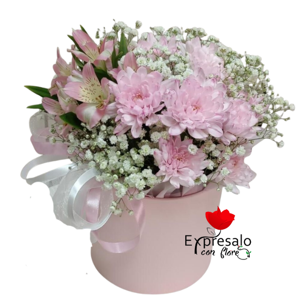 Lindo box con maule rosados, gipsofilia y astromelias, todo con lazo de cinta