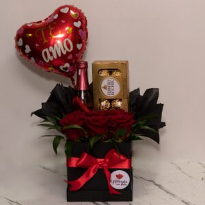 caja con 6 rosas, un espumante, un globo y 6 chocolates de Ferrero Rocher.