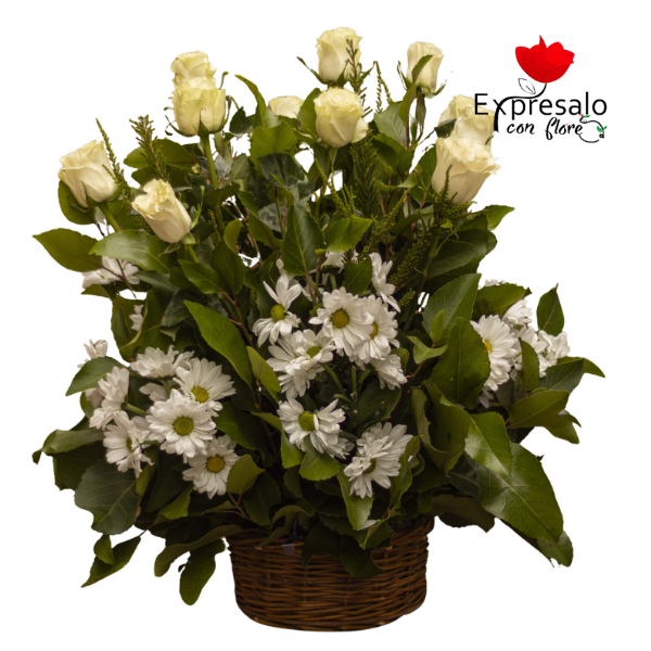 Lindo canasto con 12 rosas blancas importadas, verde y margaritas.
