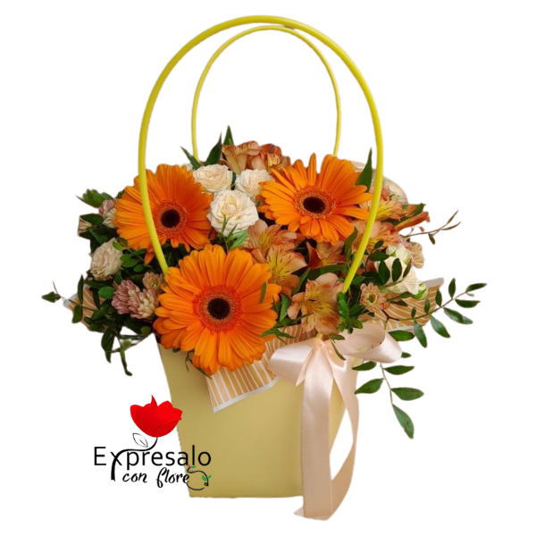 Linda cartera con 3 gerberas naranjas, astromelias naranjas, follaje y verde, todo con lindo lazo de cinta satinada.