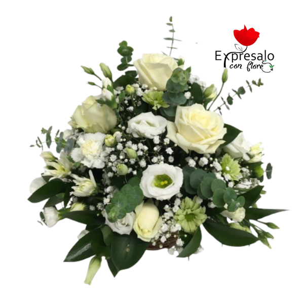 Lindo centro de mesa con flores blancas, verde y ilusión.
