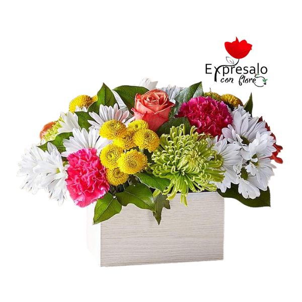 Fino centro de mesa con margaritas, maule amarillo y verde, rosas, claveles y verde de temporada