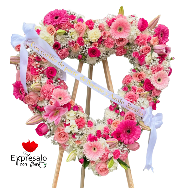 Linda corona de condolencias con gerberas, lirios, maule blanco y flores rosadas, todo con cinta personalizada (elegir frase al momento de comprar)