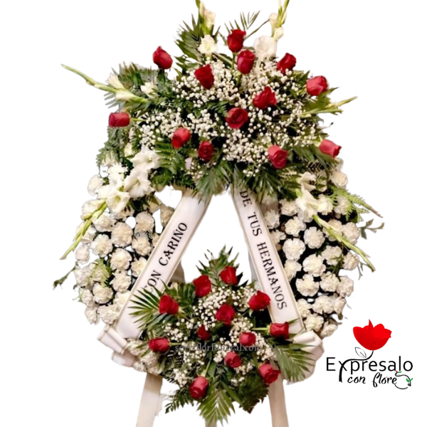 Fina corona con 25 rosas rojas importadas, maule blanco, follaje de temporada y cinta personalizada (elegir cinta al momento de comprar)