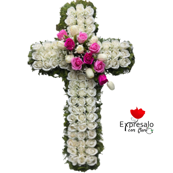 Cruz Fúnebre de Rosas Eternas Blancas y Rosadas