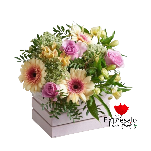 Fino arreglo en base de madera con gerberas, rosas y follaje de temporada.