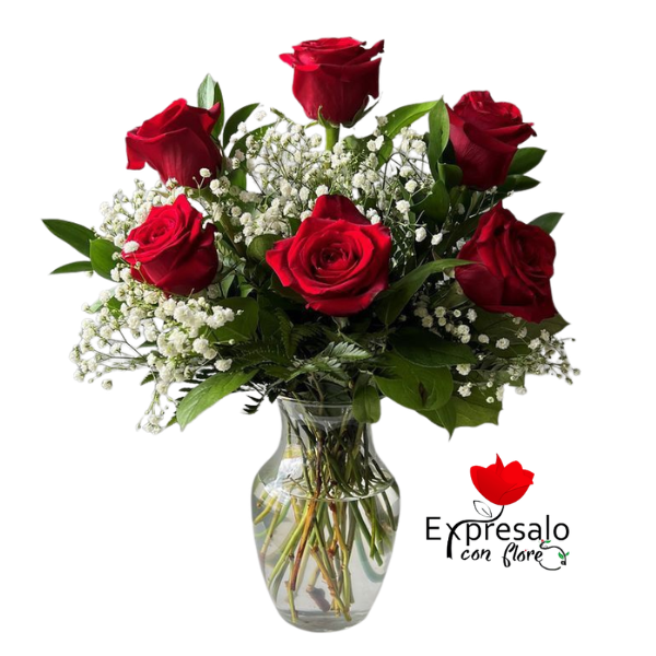 Lindo florero con 6 rosas rojas y gipsofilia mas verde