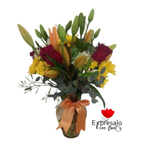 Lindo florero primaveral con lirios, maule, rosas y eucalipto con fino lazo de cinta satinada.