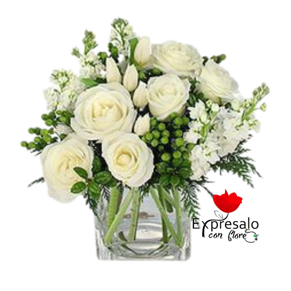 Lindo cubo con 6 rosas blancas, verde de temporada y follaje