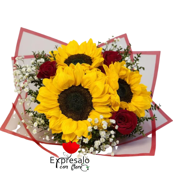 Lindo ramo con 3 girasoles, 3 rosas rojas mas gipsofilia y verde, todo en fina envoltura de papel coreano mas lazo con cinta de tela.