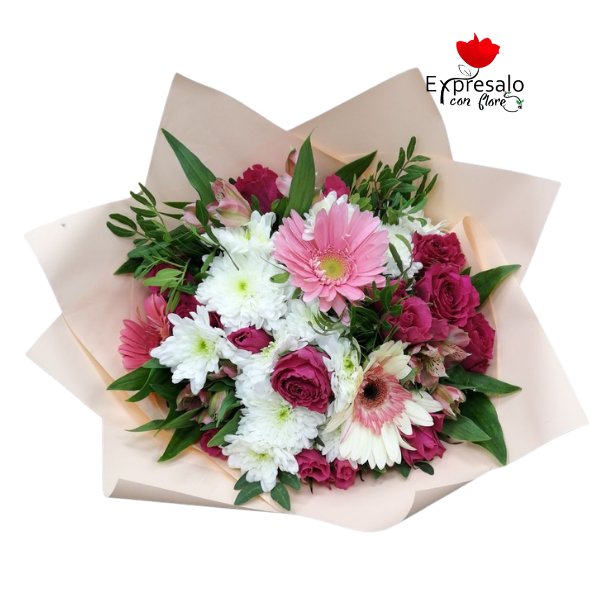 Fino ramo con flores surtidas que incluye gerbera, maule, verde y rosas, todo en fina envoltura de papel coreano mas lazo con cinta de tela.