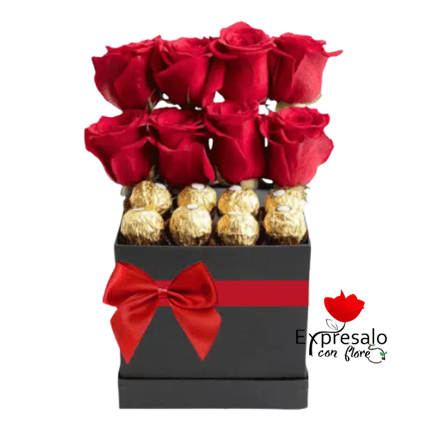 Lindo box con 8 rosas rojas importadas y 8 deliciosos bombones, todo con fino lazo de cinta satinada.